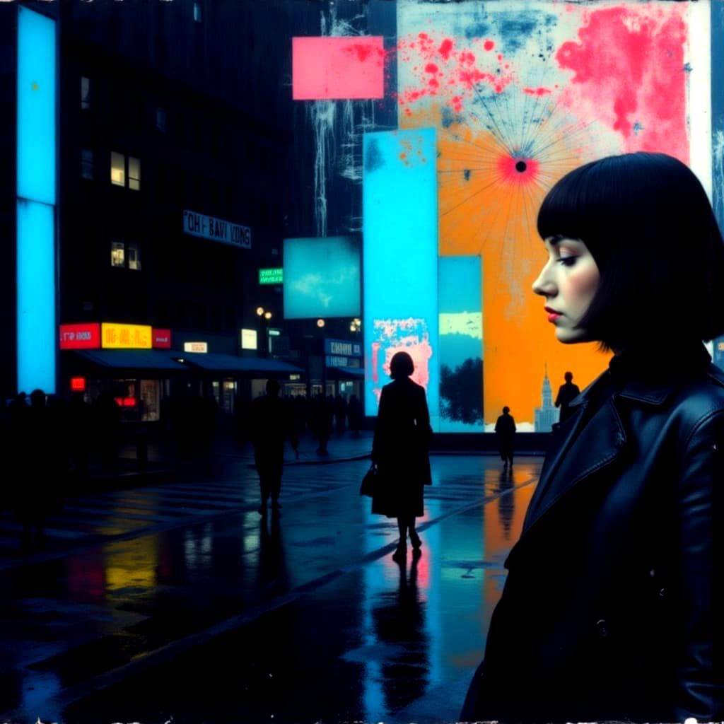 A vibrant image captures a neon-lit city street at night, reminiscent of 1950s New York, in a synthwave aesthetic. Soft focus and glitch art techniques enhance the rainy atmosphere.