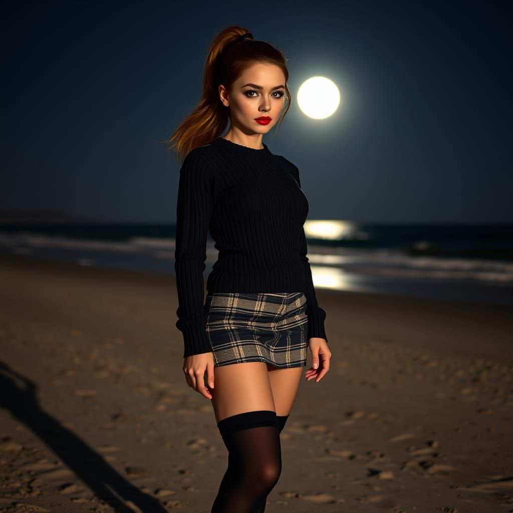 This photorealistic image shows a detailed, high-resolution scene of a woman on a beach at night. Dramatic moonlight illuminates her, creating a cinematic effect.