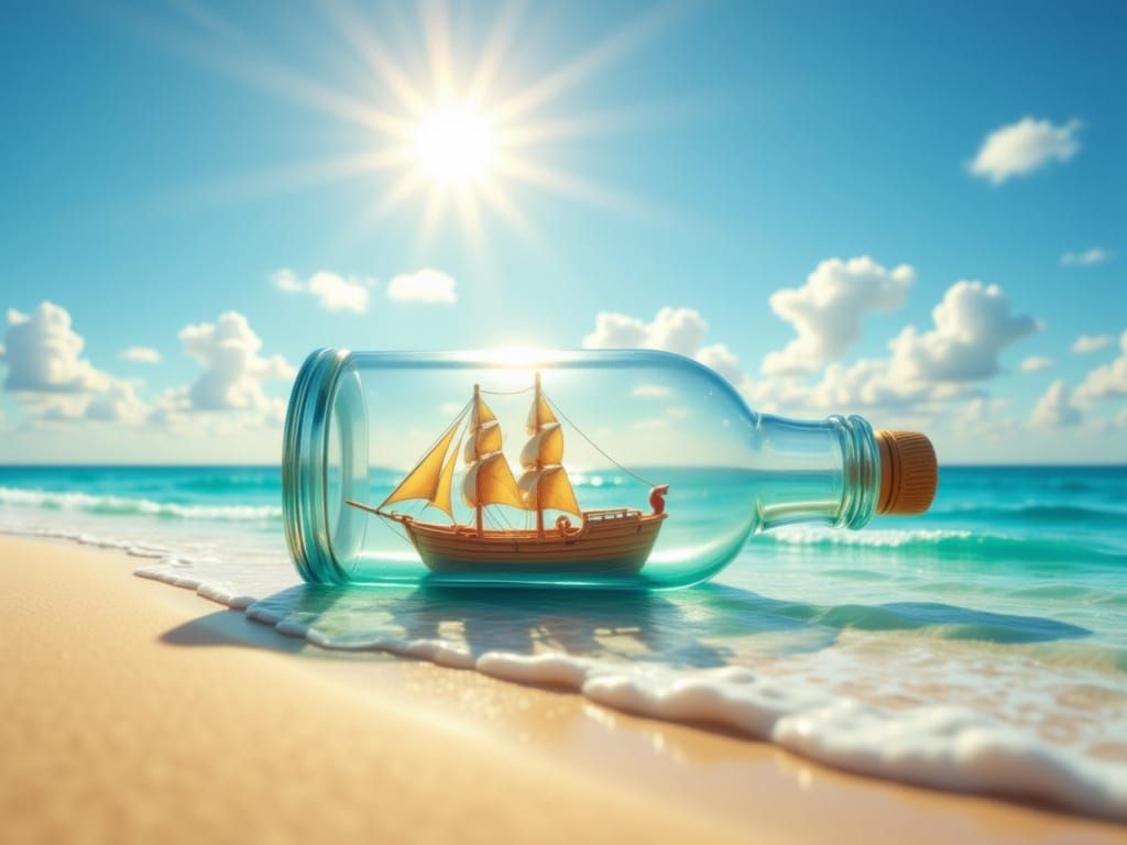 This image shows a detailed, realistic bottle with a colorful sail ship inside, floating on a golden beach and blue ocean under a sunny sky. A far-away shot captures the intricate scene.