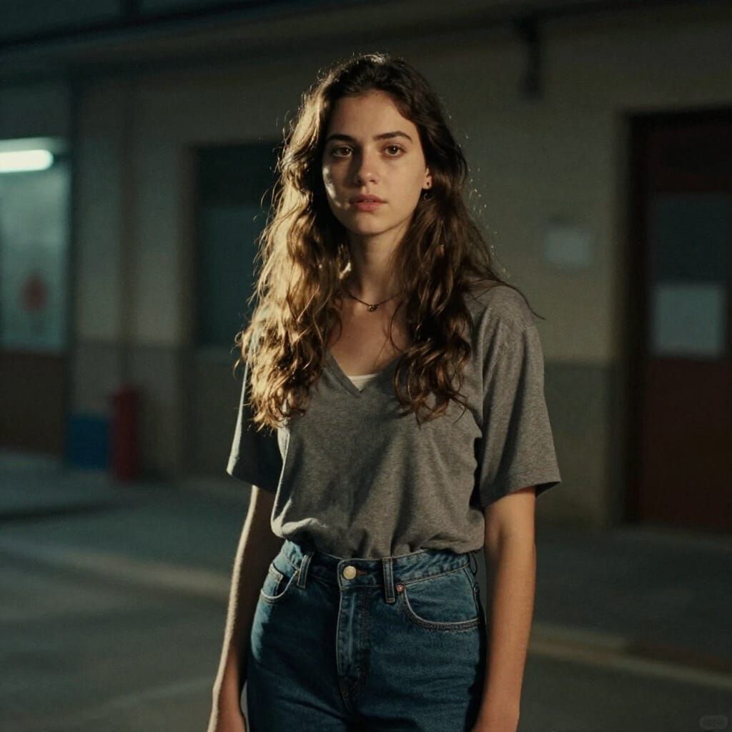 This image shows a young woman in a natural, everyday fashion pose, captured in a realistic cinematic style with film grain and atmospheric lighting.