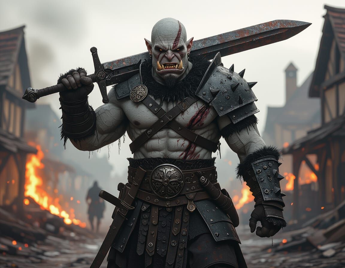 A towering orc strides through a burning village, a massive sword resting on his shoulder. The image features a dark fantasy aesthetic with intricate details and deep colors.