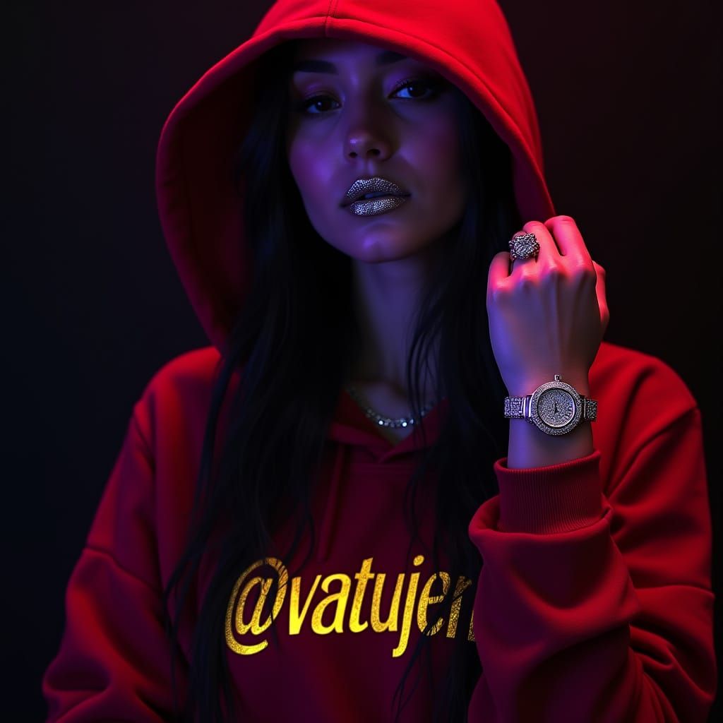 A hyper-realistic portrait of a girl in a red hoodie with gold neon print, set in a dark, glowing cyberpunk club. Features dramatic shadows and luxurious details.