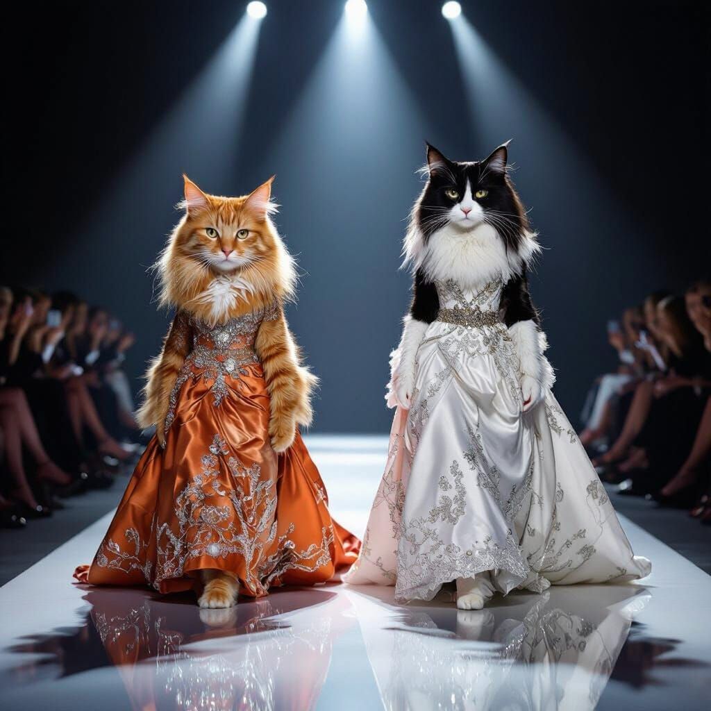 This image shows a male orange tabby and a female tuxedo cat modeling designer gowns on a modern runway. Rendered as a hyperrealistic digital painting with dramatic lighting, capturing opulent textures and vivid colors.