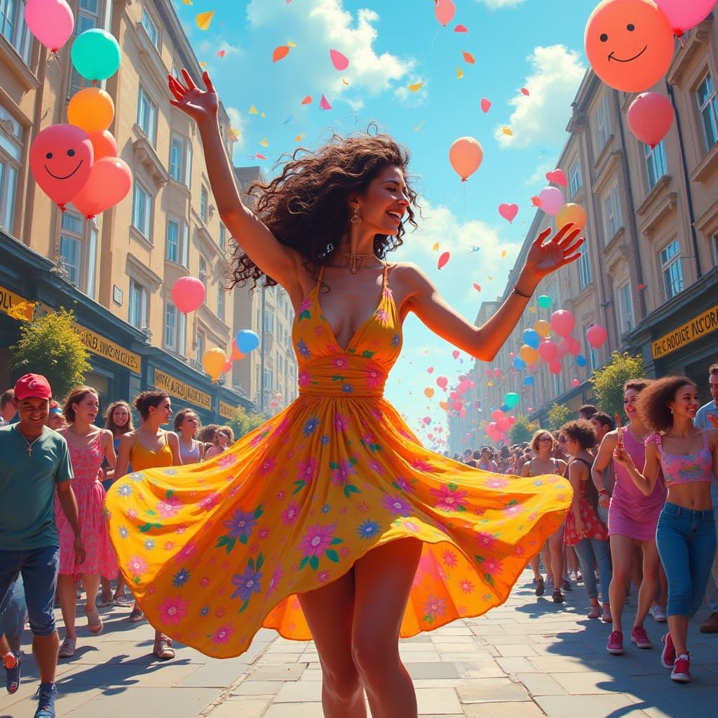 This image depicts a vibrant street scene in London, featuring a lively woman dancing amidst a colorful Jubilee parade, surrounded by balloons and street performers, in a style blending bold lines and whimsical digital art.