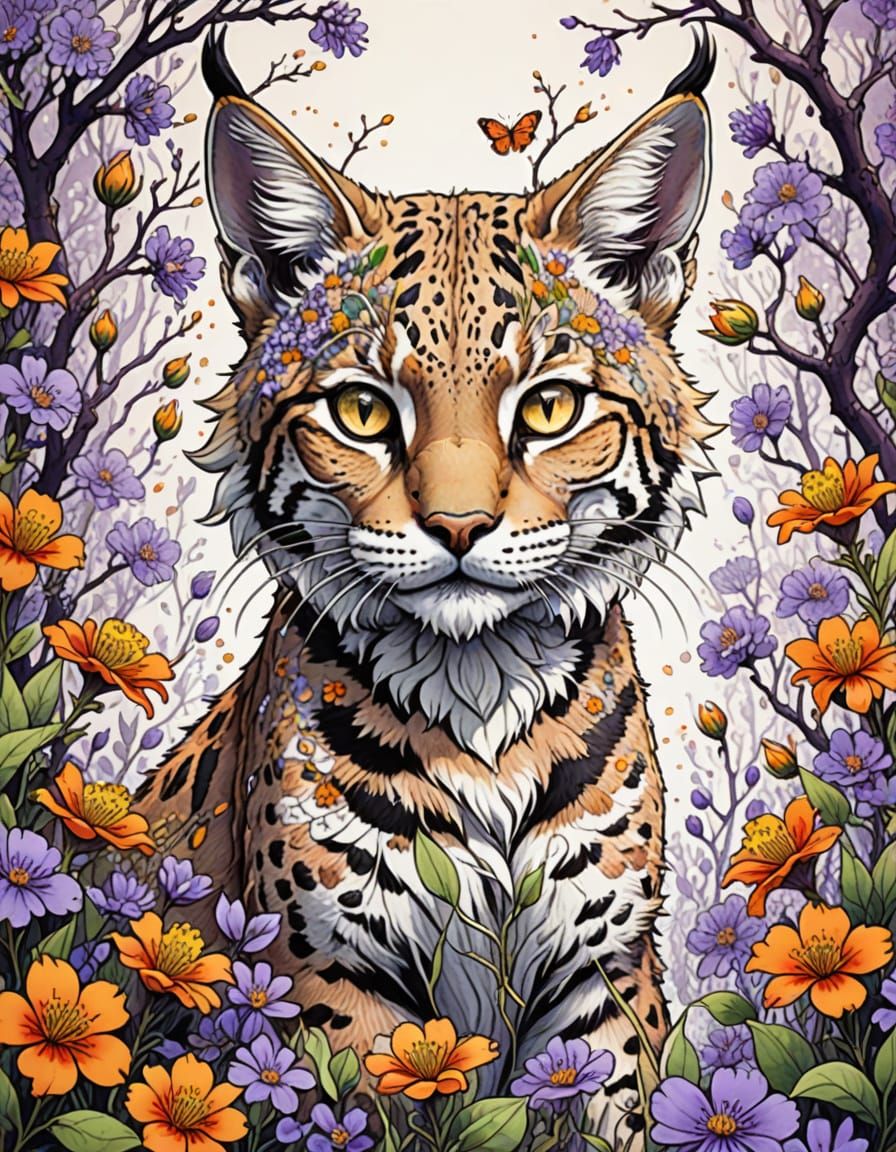 This image shows a cute bobcat surrounded by flowers, rendered as a watercolor coloring book page. The artwork features a purple and orange color palette with botanical elements in an anime art style.