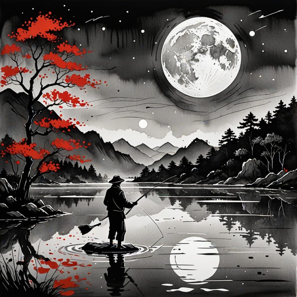 This image shows a man fishing in a lake under the moonlight, created in a Korean ink illustration style. The artwork features expressive bold lines, ink drips, vibrant red accents, and golden moonlight reflections.