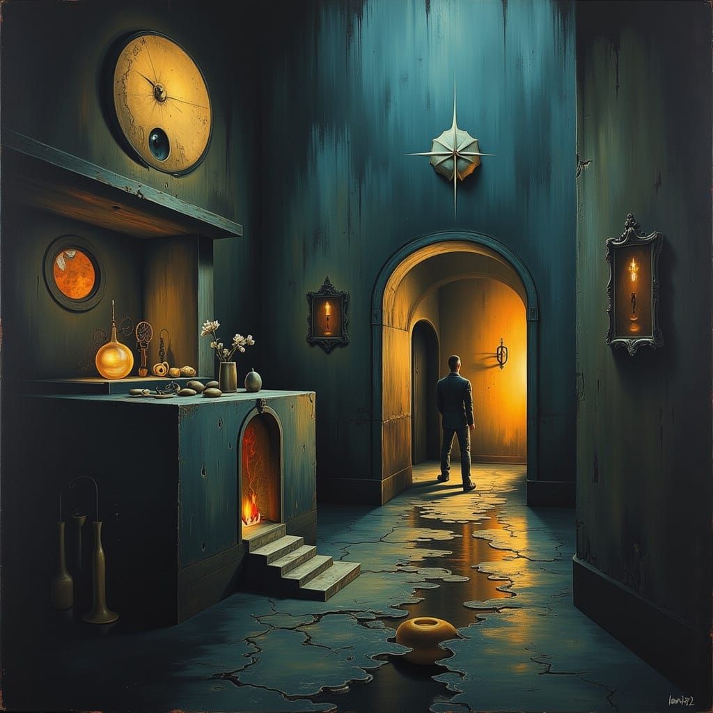 When you're trying to be a mopey middle aged man past midnight, but you keep being interrupted by Frank Sinatra. Intensely surreal imagery and atmosphere, hypnagogia, liminal, a mixture of 20th century Surrealist influences, Rembrandt lighting, rich textures, oil on canvas.<lora:STRANGE WORLD:1.0> <lora:Liminally ...