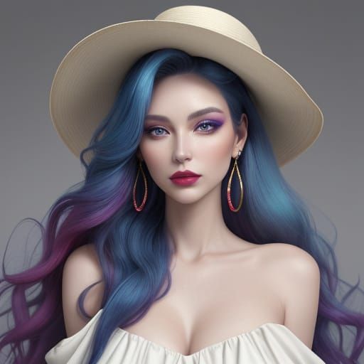 A hyperrealistic portrait of a woman with rainbow hair and striking blue eyes. She wears a wide-brimmed hat with rainbow stripes and red lipstick, enhanced by soft focus.