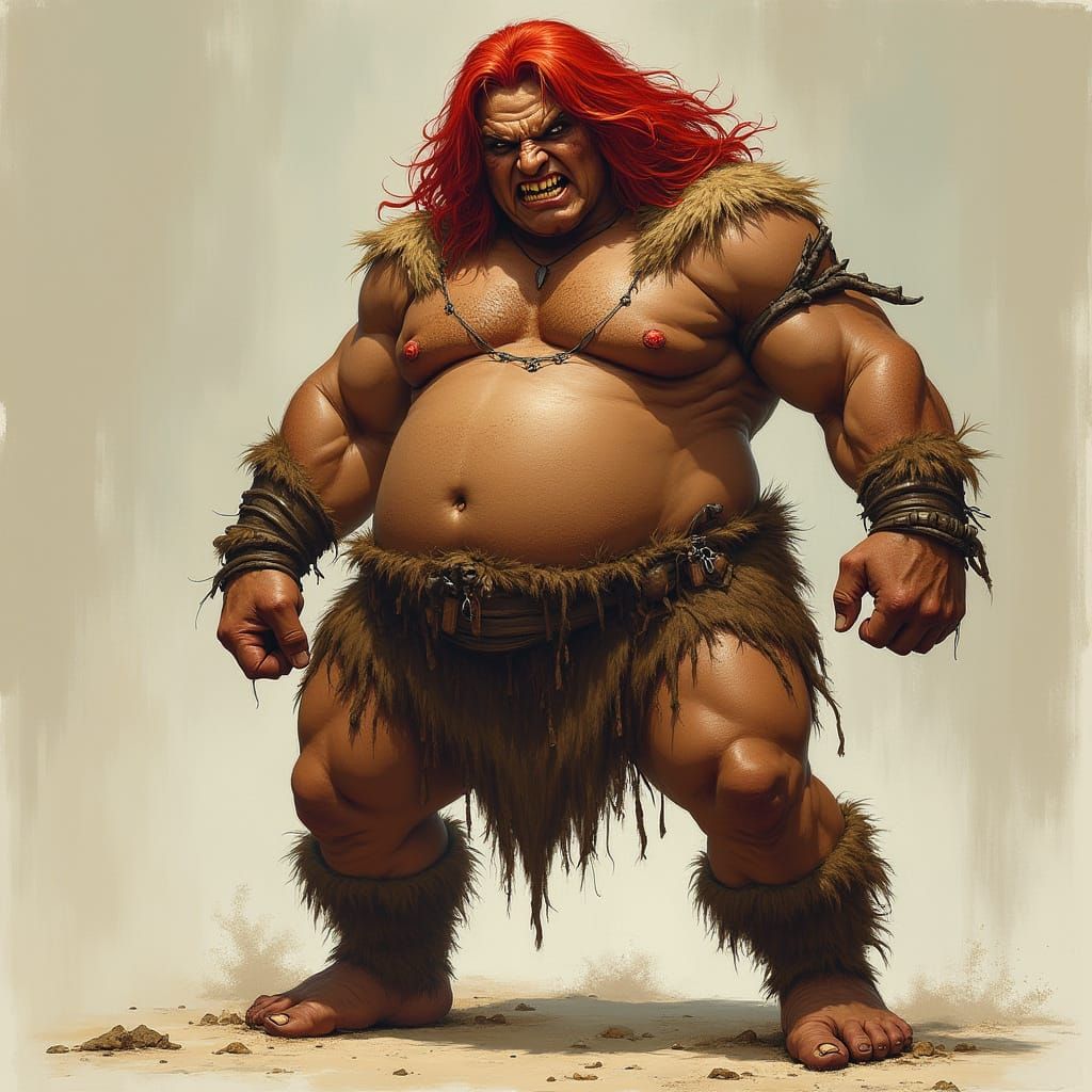 This image shows a very overweight cavewoman with dark skin and red hair, dressed in animal hides. The artwork, reminiscent of classic fantasy illustrations, features bold brushstrokes and earthy tones.
