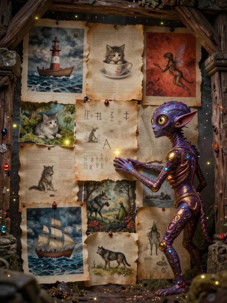 A surreal collage features a Lovecraftian creature pinning parchment pages to a wall. Macro photography captures a dreamlike atmosphere with fireflies and muted earthy colors.