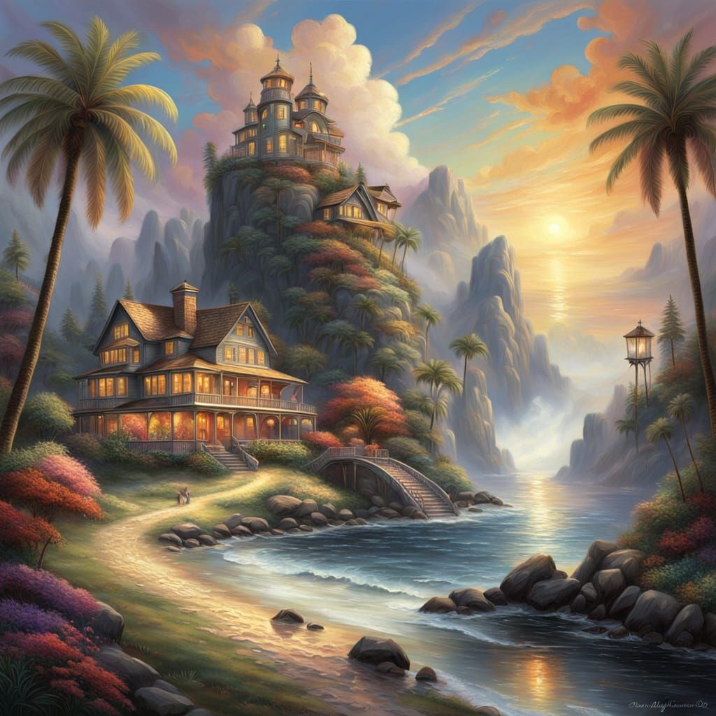 A vibrant drawing of a couple silhouetted behind palm trees at sunset. The image is rendered with thick brushstrokes and warm, golden lighting in an ethereal neo-impressionistic style.