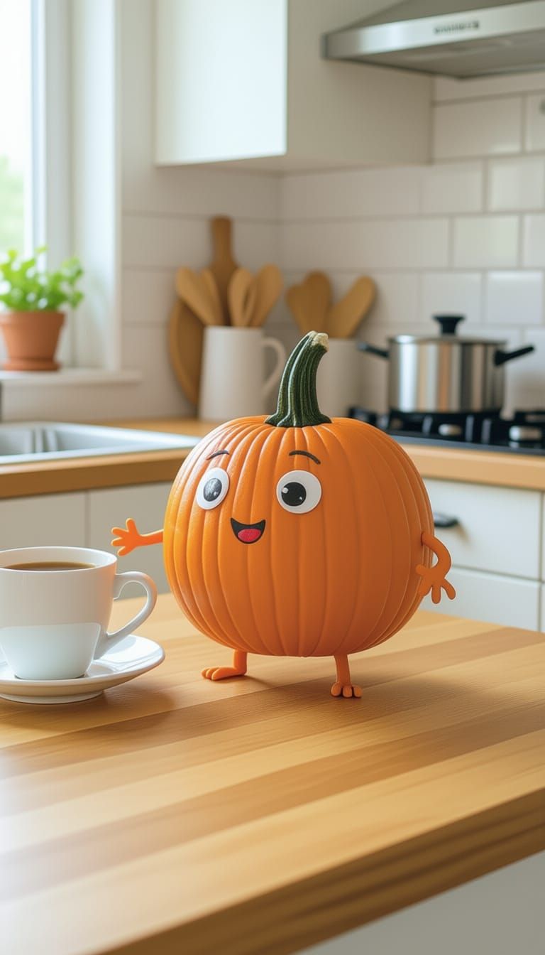 This professional photograph captures a charming, anthropomorphic pumpkin enjoying a cup of coffee in a kitchen setting. The image features sharp focus, bokeh, and natural lighting for a realistic feel.
