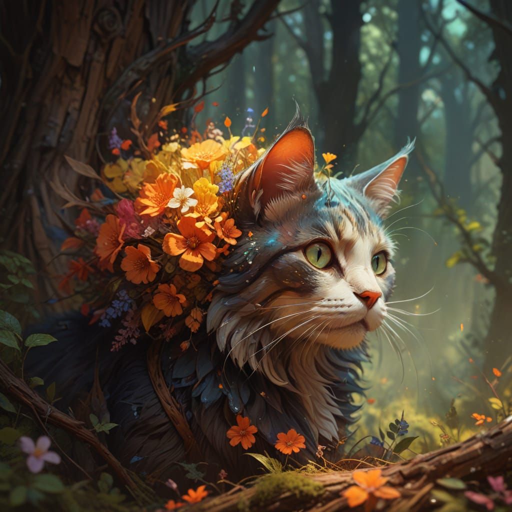 This striking pop art portrait captures a close-up of a fantastical cat surrounded by a vibrant forest, with intricate floral patterns and bold lines reminiscent of Alphonse Mucha's Art Nouveau style. The image features textured fur, stained glass eyes, and dynamic lighting, blending elements of surreal ...