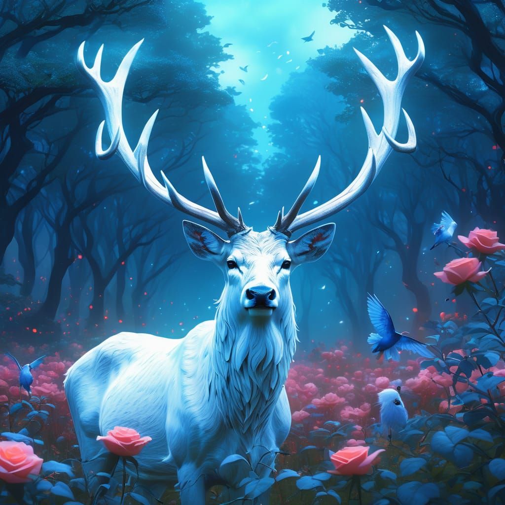 A striking picture of a white stag with large antlers in a meadow. Glowing rose vines are entwined around the antlers, with soft blue birds flying nearby. The scene is bathed in iridescent light as digital art.