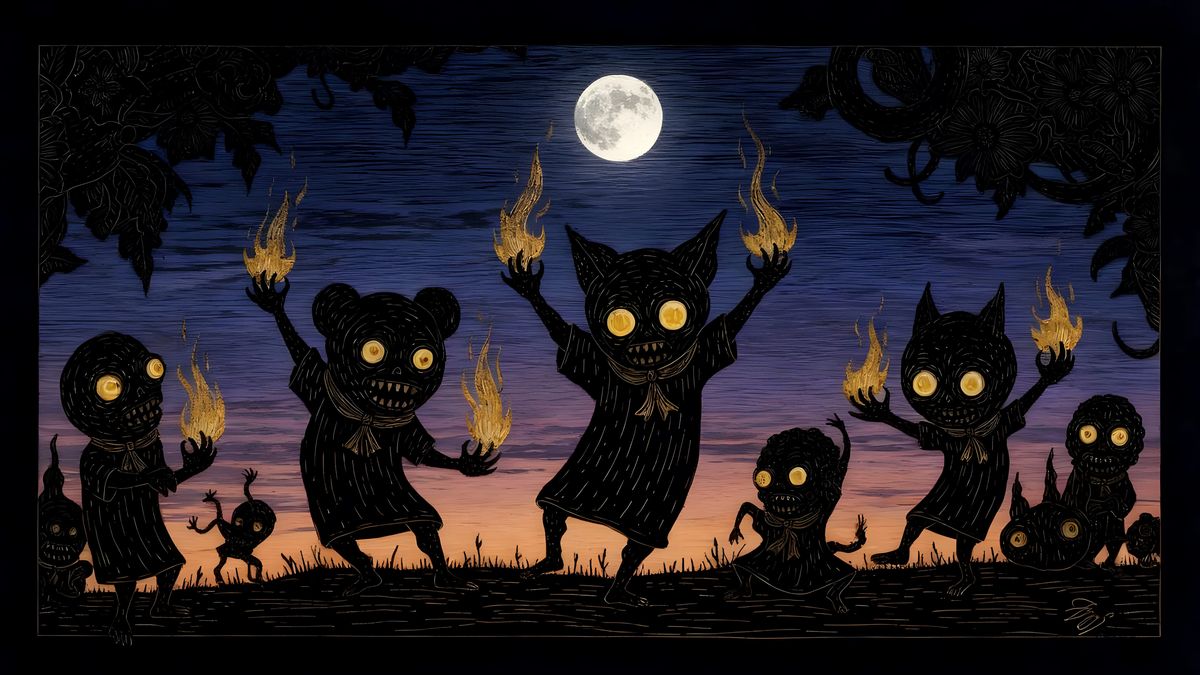 This image shows creepy creatures in a graveyard celebration, rendered in a surrealistic watercolor and encaustic style with golden inks and mixed media for a whimsical, detailed look.