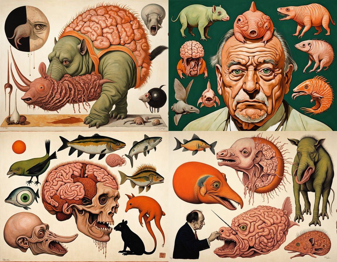 A bizarre, surreal creature rendered in a Ukiyo-e style. The monstrous, mythical hybrid is depicted with vivid neon colors, creating a disturbing yet captivating visual.
