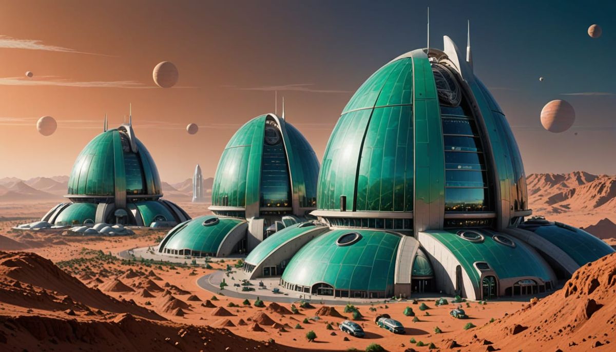This image depicts a unique blend of architecture on two planets, featuring gleaming skyscrapers, iridescent houses, and Starfleet headquarters in a futuristic, otherworldly setting.