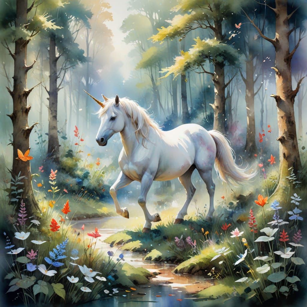 This image shows a magical forest glade with a unicorn and various animals, created with delicate watercolour techniques and a cinematic feel.