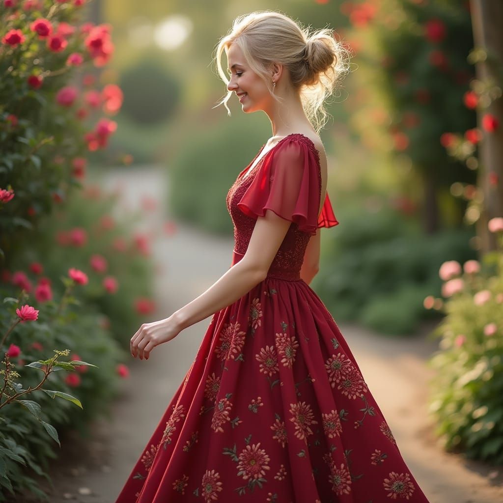 A digital portrait of a smiling woman with blonde hair in a red dress walking through a flower garden, petals falling around her. The artwork features soft lighting and vibrant colors reminiscent of digital acrylic paintings.