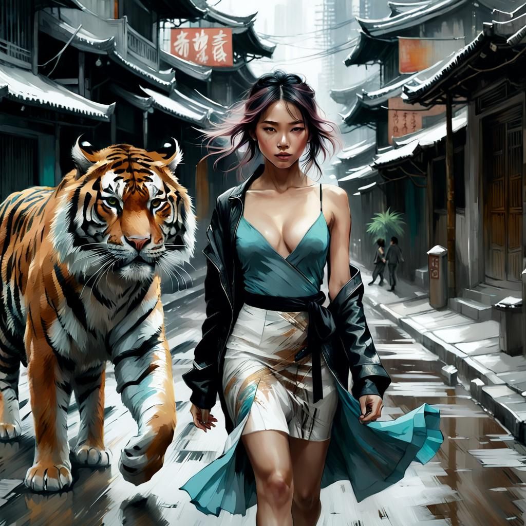 This image shows a stunning Asian woman walking with a tiger on an empty street. The scene is rendered as hyperrealistic digital art with intricate details and atmospheric, cinematic lighting.