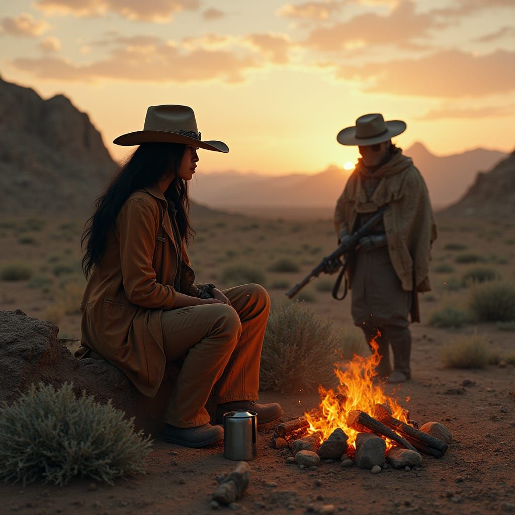 A striking picture of a woman camping in a desolate landscape. A humanoid robot stands guard nearby, set against a backdrop of hills bathed in golden light, rendered with gritty textures.