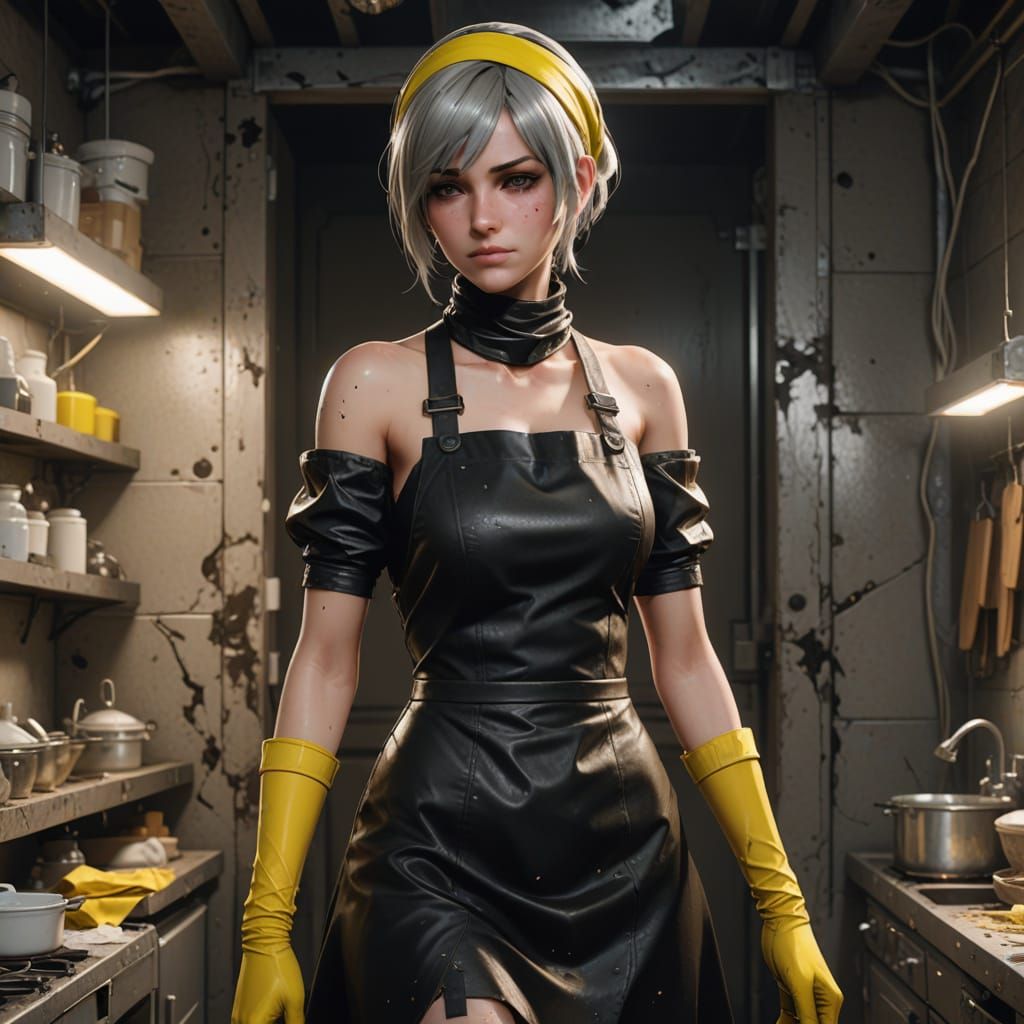 This image shows a young charwoman in a cleaning closet, surrounded by the tools of her trade. She wears smudged yellow gloves and a worn dress, with a rubberized headscarf and apron. The scene is rendered in vibrant triadic colors and features intricate details, with dynamic lighting and volumetric effe...