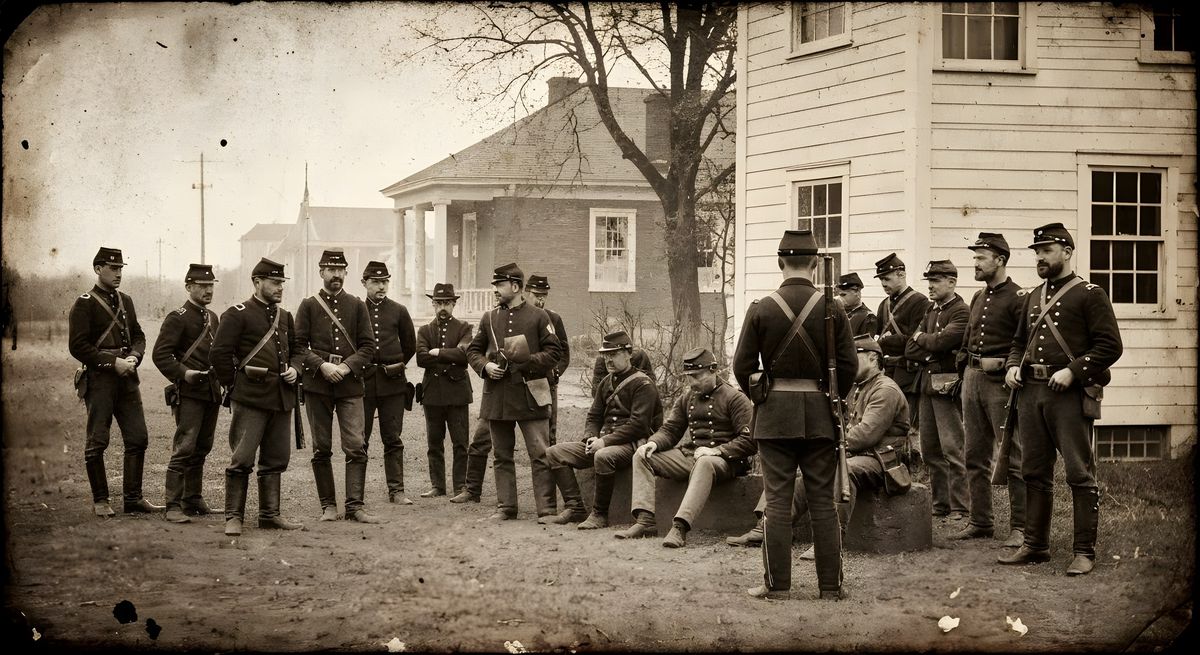 This image shows soldiers outside Appomattox Court House in 1865. The sepia-toned photo evokes vintage documentary photography with dramatic lighting and textures, capturing a pivotal moment at the Civil War's end.