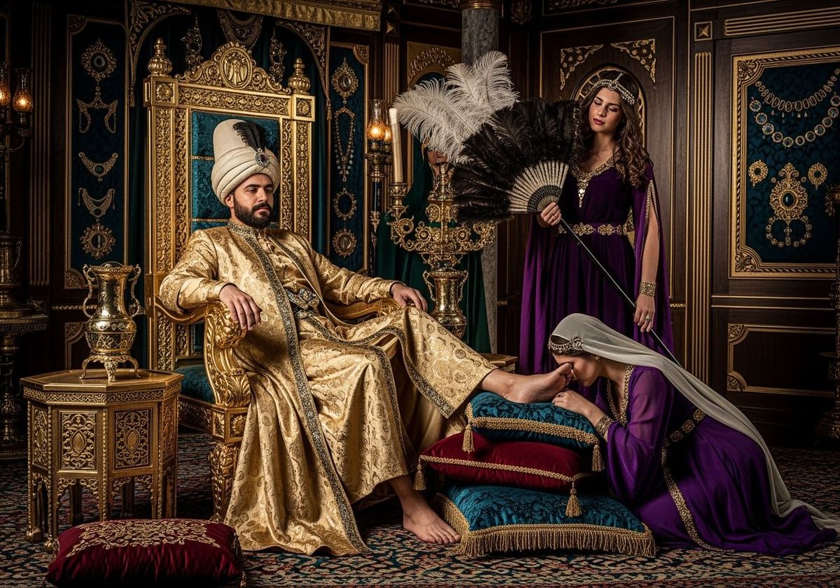 This image depicts an Ottoman Sultan in a gold silk kaftan relaxing on a jewel-encrusted throne within his harem. Concubines attend to him in the opulent setting, captured with sharp focus and natural lighting.