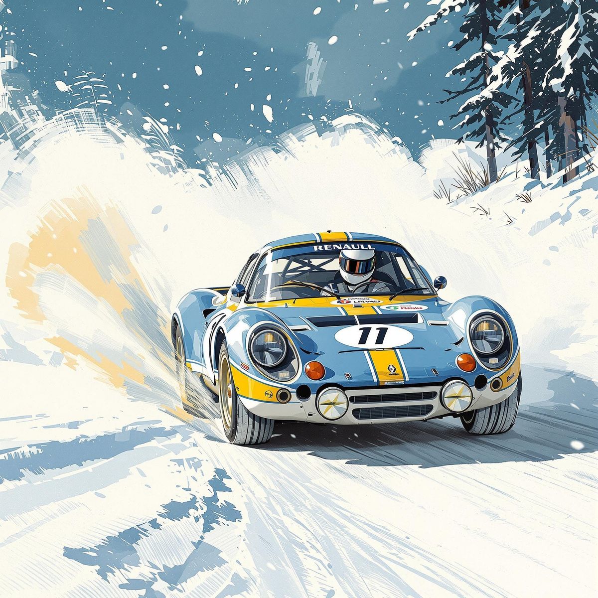 This image shows a vintage 1971 Renault Alpine A110 mid-corner on a snowy rally stage. The dynamic illustration evokes a vintage motorsport scene with textured visible brushstrokes and a racing aesthetic.
