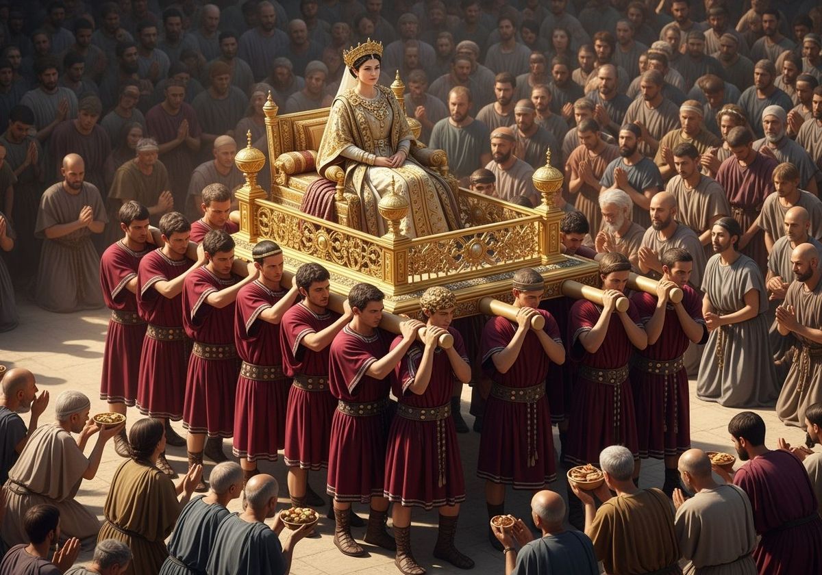 This image shows a Roman Empress carried on an ornate gold litter by servants, gazing regally. The scene is bathed in warm light, drawing focus to the Empress amidst a kneeling crowd.