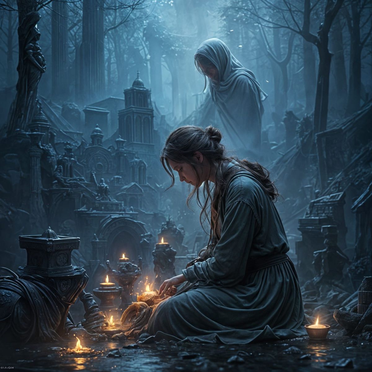 Una donna in ginocchio davanti alla lapide di suo padre con il volto nelle mani che piange la sua perdita. Dietro di lei il fantasma di suo padre che la abbraccia. La scena si svolge in un cimitero in una giornata cupa e nuvolosa.