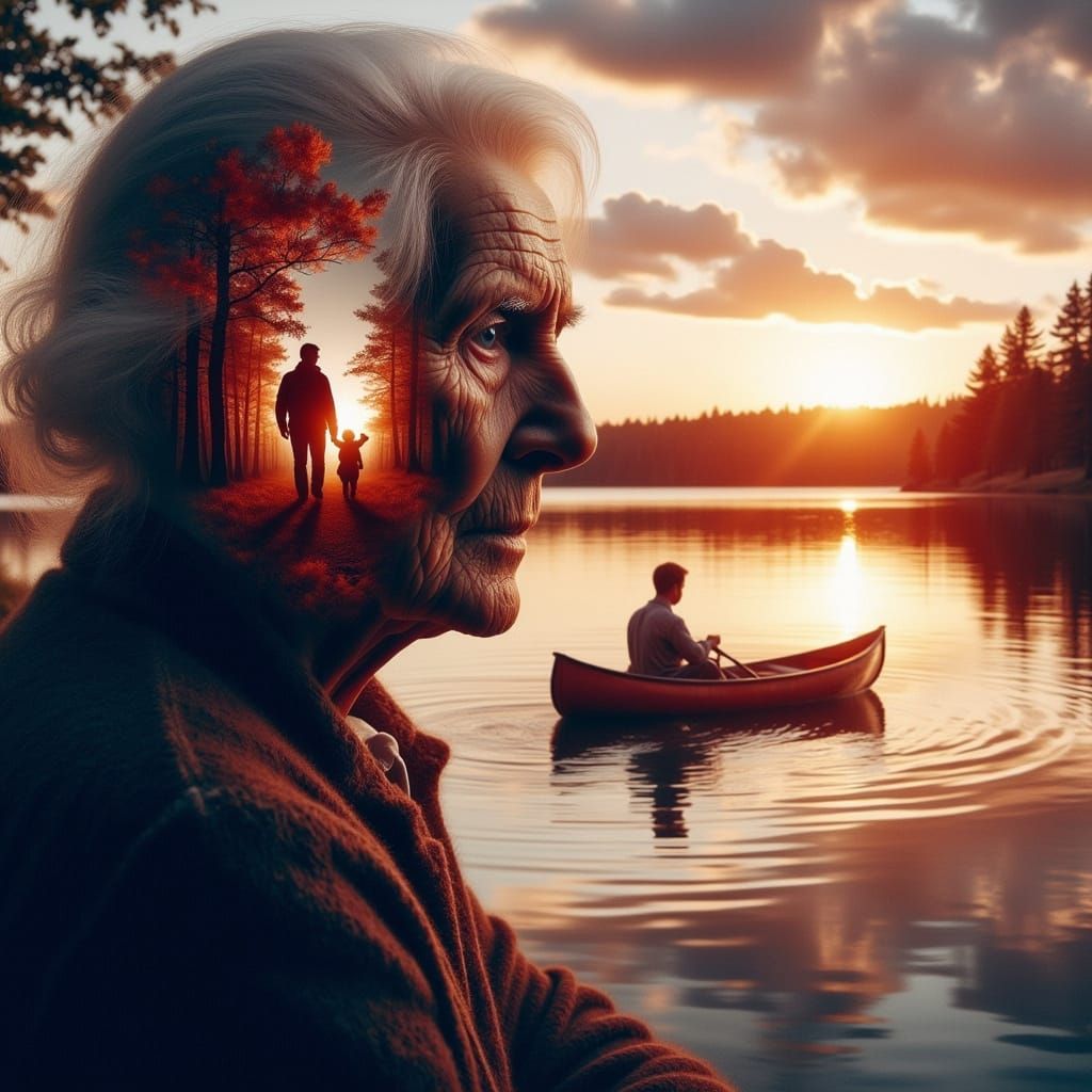 This photorealistic image captures an elderly man looking at a lake, with a superimposed memory of his father teaching him to fish at sunset. Shot with a DSLR for ultra-detail.