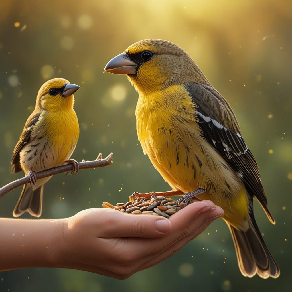 A vibrant digital painting of a boy's hand as evening grosbeaks land to eat sunflower seeds. The image uses impasto techniques to detail the birds' textured feathers in a warm golden light.