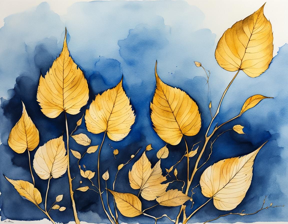 A drawing of golden skeleton leaves in minimalist line art. The blue ink drawing features subtle ink splatters and splashes, creating a delicate watercolor aesthetic.