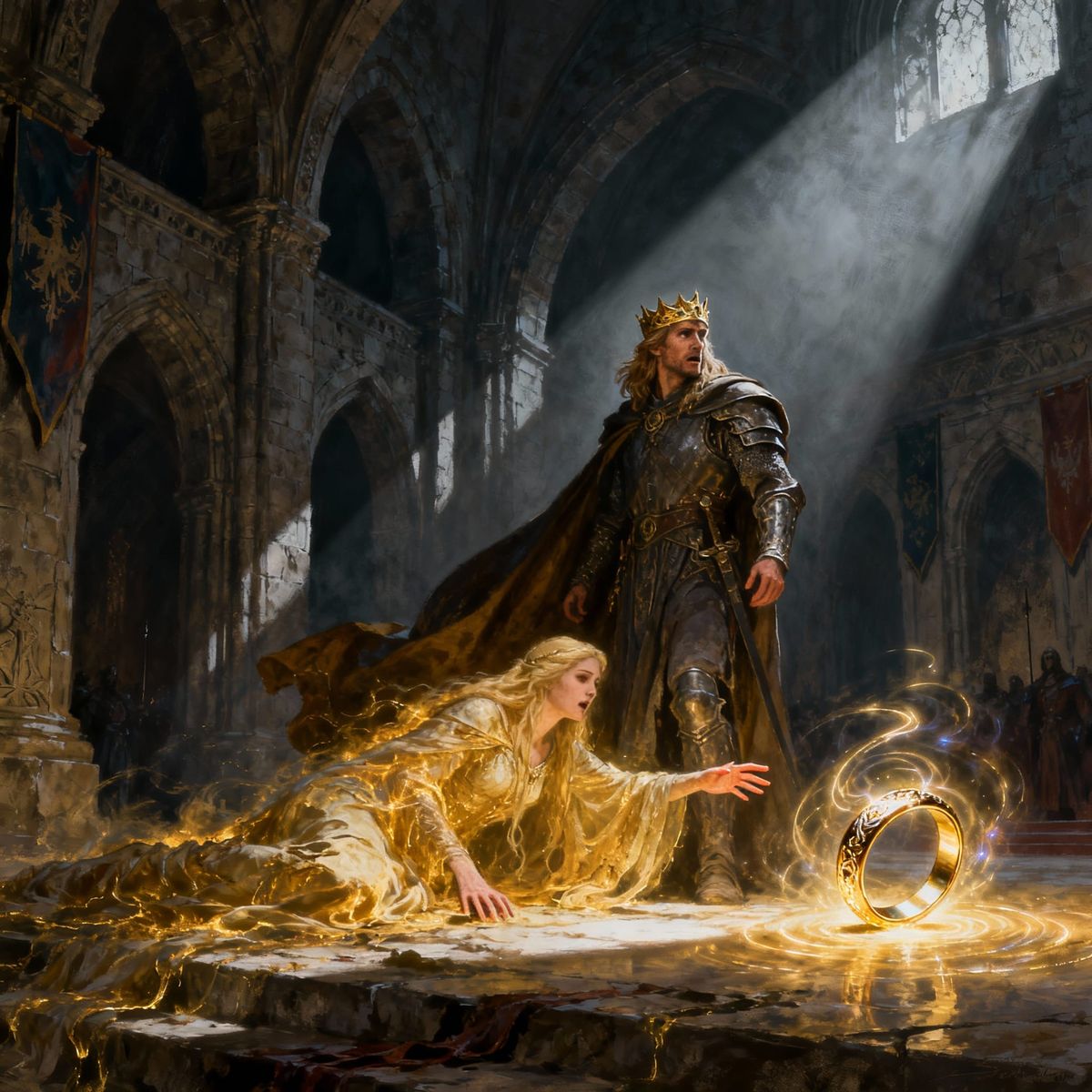A king's coronation turns to despair as his love collapses, overcome by the One Ring's dark power. Epic fantasy illustration with dramatic lighting and magical effects.
