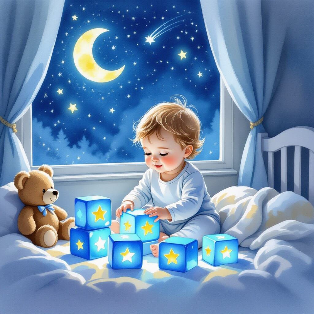 A beautiful image of a baby playing in their nursery at night. Soft starlight illuminates the room, filled with glowing moon and star-shaped blocks, creating a magical and peaceful atmosphere as watercolor storybook art.