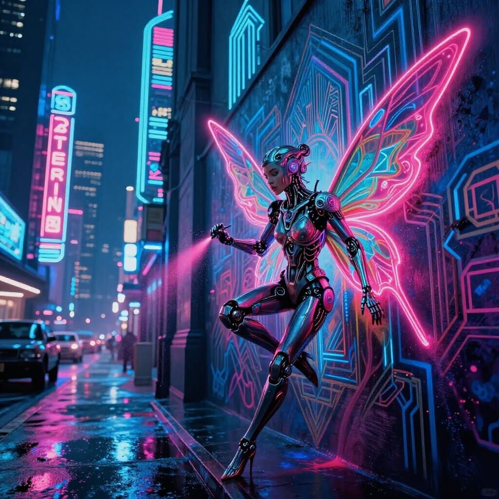 This image shows a cyborg fairy with mechanical wings painting vibrant street art in a futuristic city. The scene features neon lights, rain-slicked streets, and a hyperrealistic digital painting style.