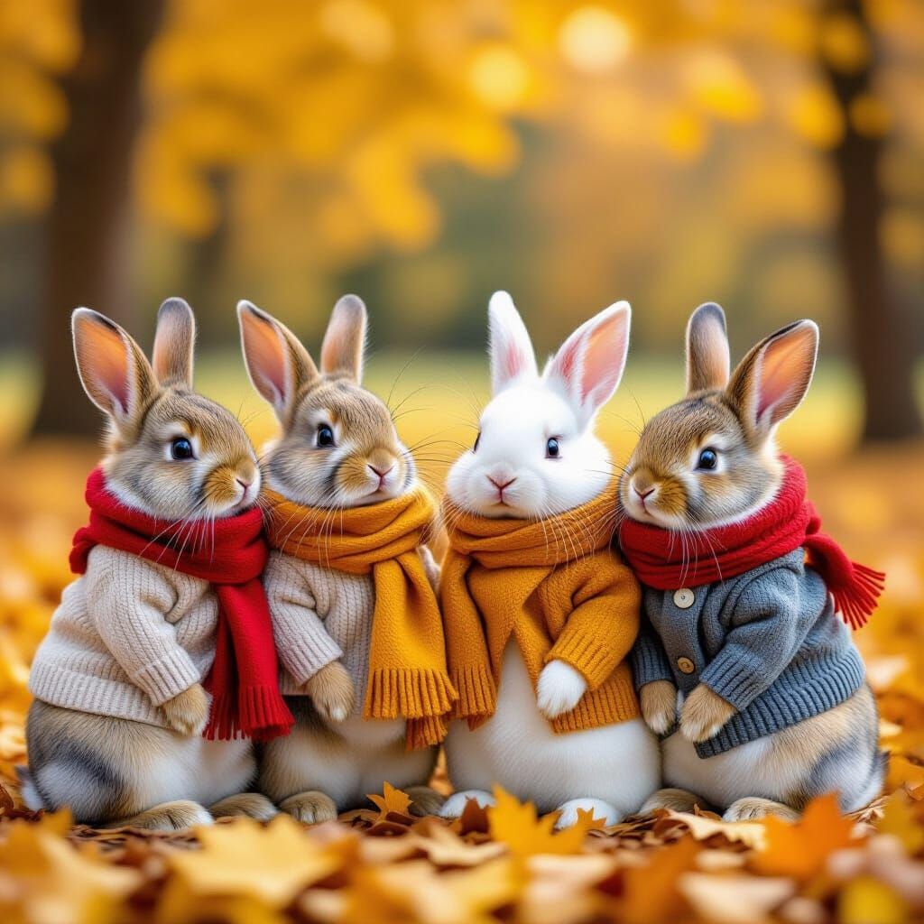 This image depicts a group of adorable bunnies dressed up for autumn, rendered in a realistic comic book style. It captures a charming seasonal scene with cute characters.