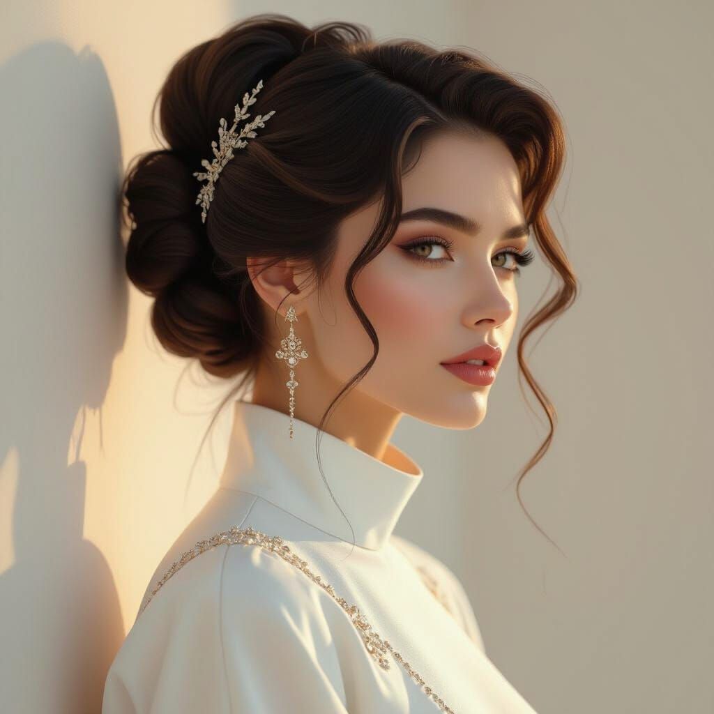A captivating image of a woman in white attire, showcasing an innovative hairstyle. Soft, warm lighting and a minimalist background enhance the subject, rendered as digital painting with cinematic realism.