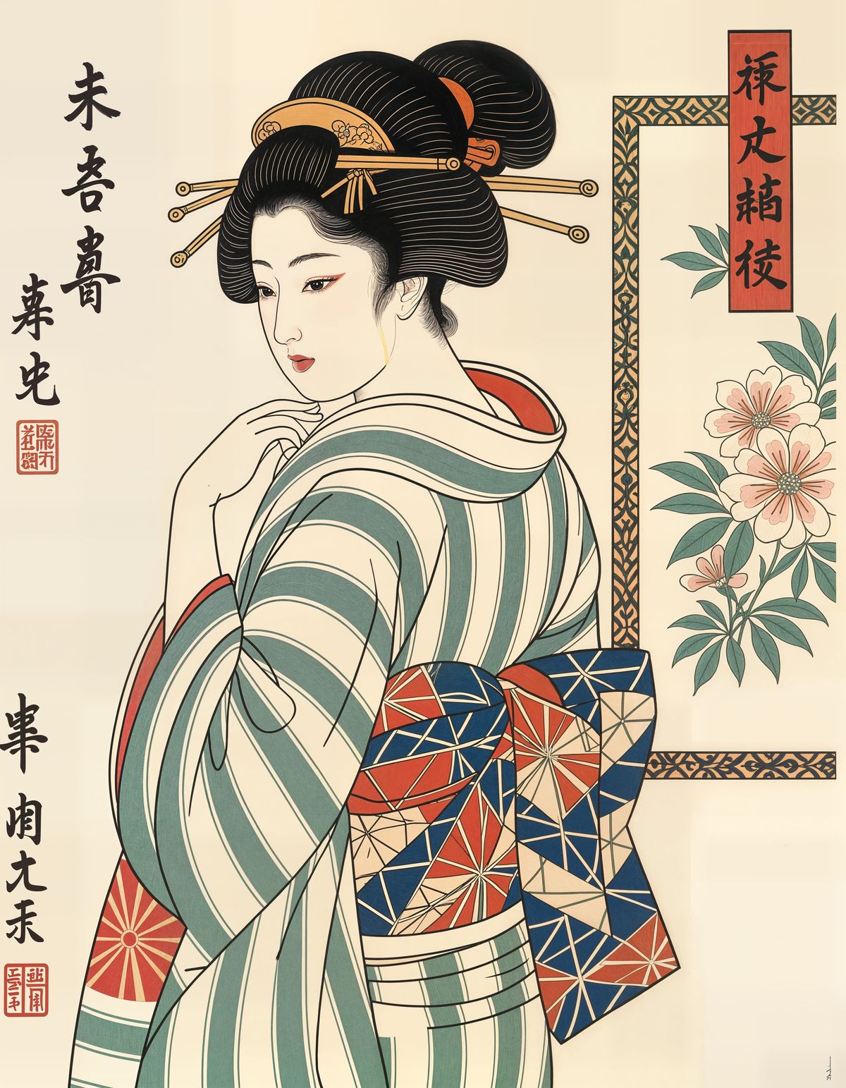 This lovely portrait features a beauty lost in thought as she dresses, glancing over her shoulder while pulling up the edge of her striped outer kimono. Her hair is elegantly arranged in a smooth bun, adorned with a comb, hairpins, and a delicate ribbon. A beautifully draped sash enhances the composition on the right. The artwork is masterfully rendered with delicate line work and soft shading, particularly on her hair.