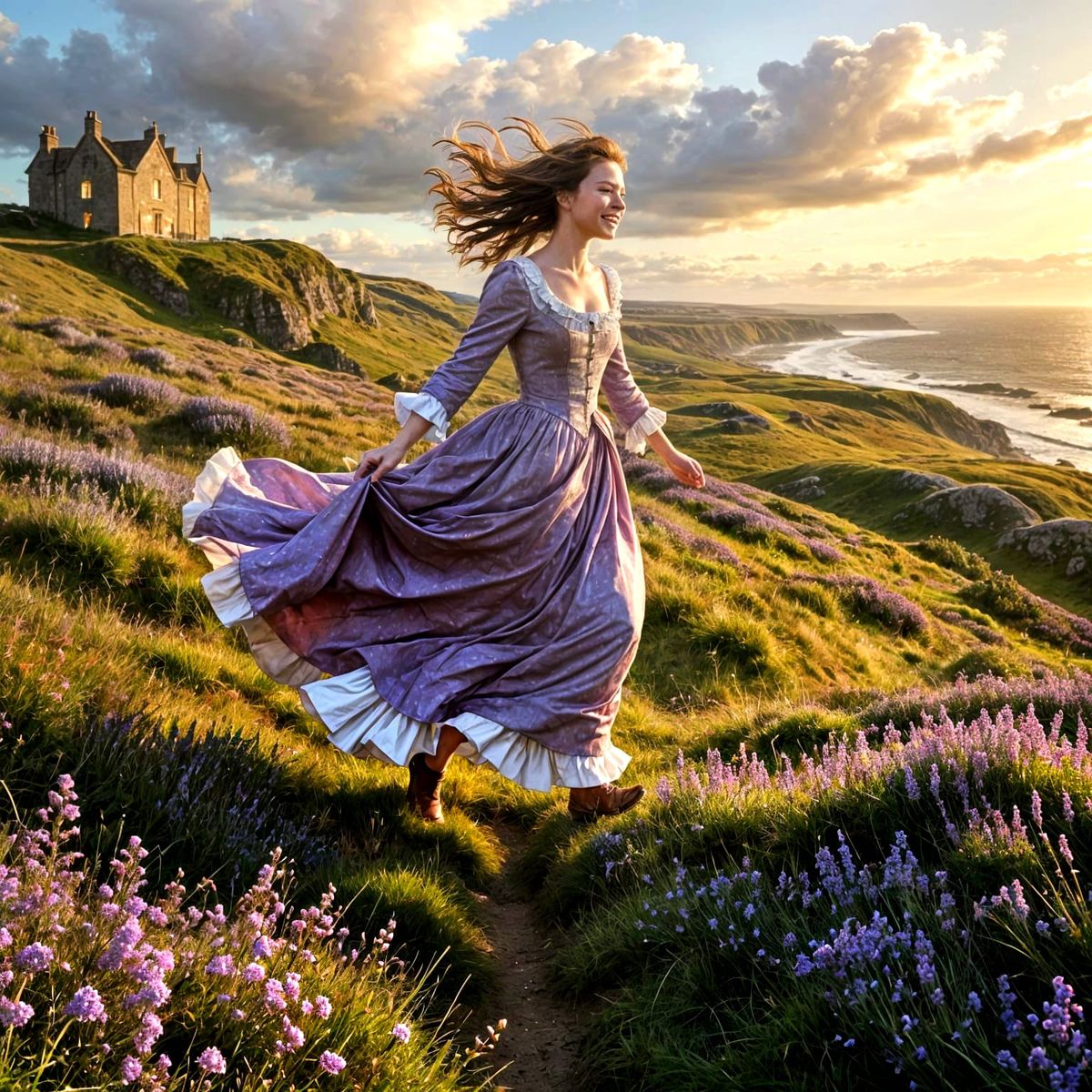 This image depicts a young woman in an 18th-century gown joyfully running through a lush English countryside with cliffs overlooking a turbulent sea, bathed in golden sunlight.