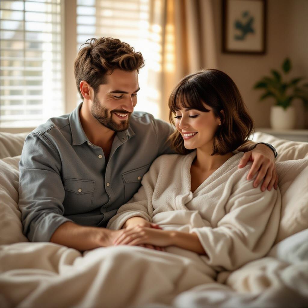 This image shows a caring man comforting his recovering cousin in a cozy home. The scene is rendered with tender, colored ink textures and delicate lines, evoking warmth and intimacy.