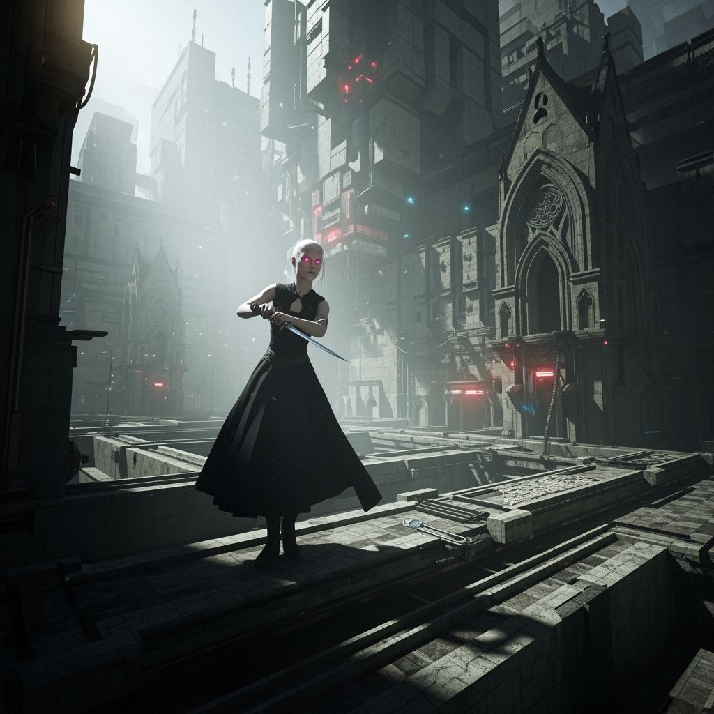 This image shows a striking albino woman with pink eyes and a dagger in a detailed, maze-like city. The scene features brutalist and gothic architecture with tech elements, rendered in a cinematic 3D style.
