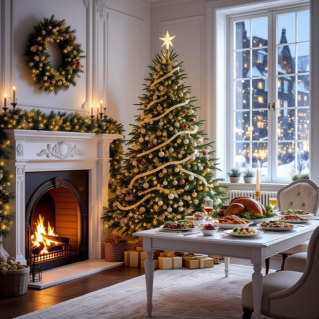 This image showcases a tall, richly decorated Christmas tree in a spacious white living room, adorned with a glowing garland and a warm fireplace. A feast is laid out, with city lights twinkling outside.