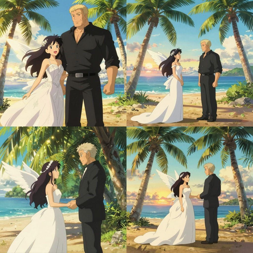Generate your own unique wedding images with an Asian fairy bride and elderly groom. Free and easy AI image creation.