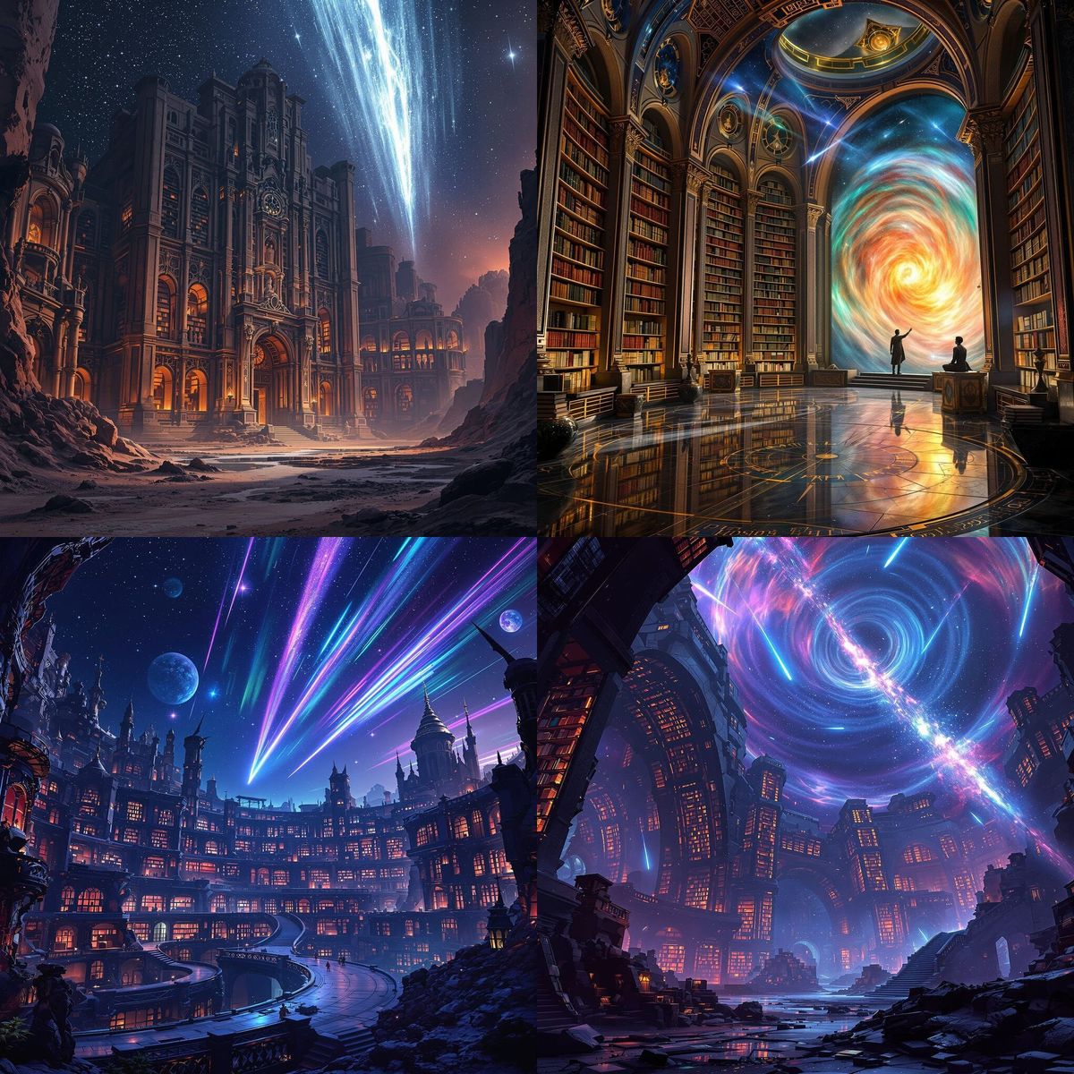 This image showcases a fantastical library on a planet, bathed in deep colors and intricate detail, with meteor showers creating a dramatic backdrop. Rendered as detailed matte painting.