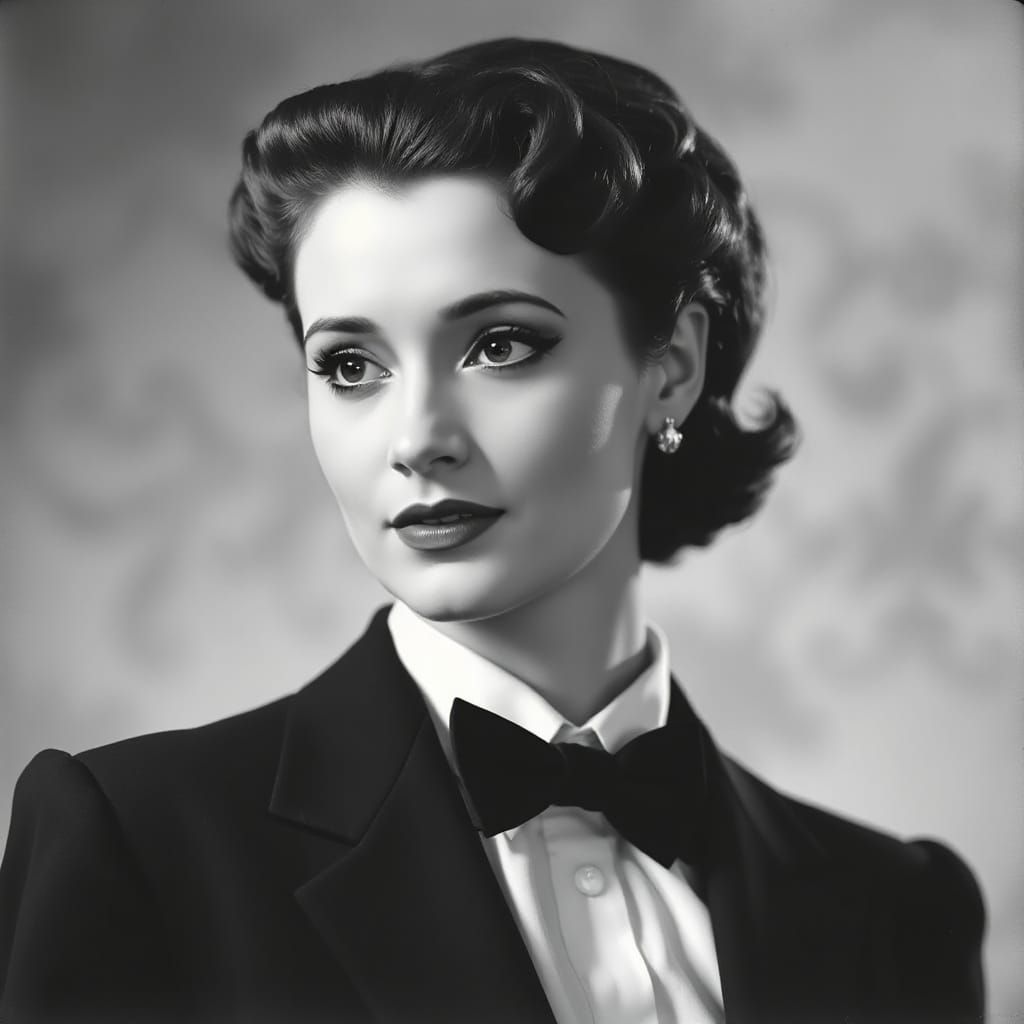 This image captures a poised woman in a timeless black-and-white portrait, dressed in a classic tuxedo with striking makeup and a confident expression, evoking the glamour of mid-20th century style.