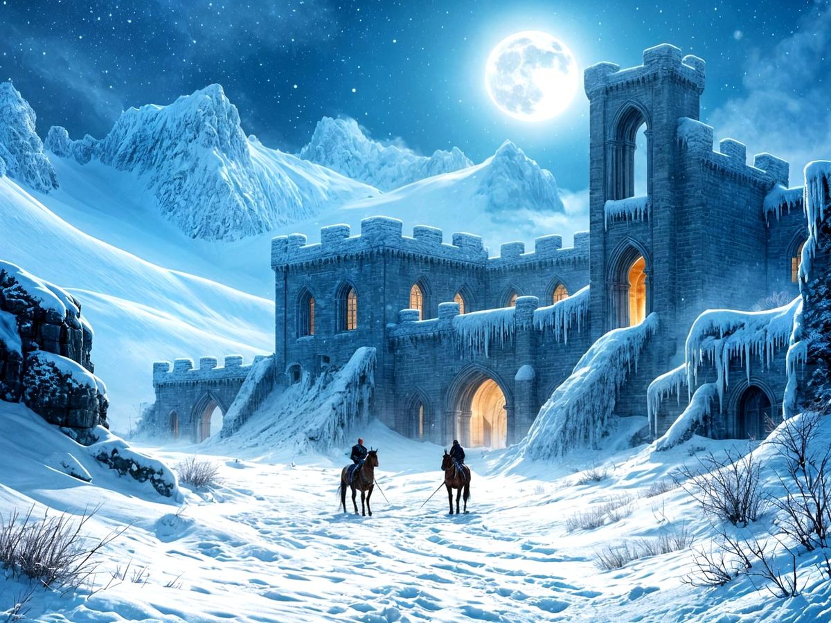 A vibrant image of horsemen nearing a snow-covered castle. The scene depicts a winter landscape with detailed ice formations and moonlight illuminating the ancient, ruined architecture.