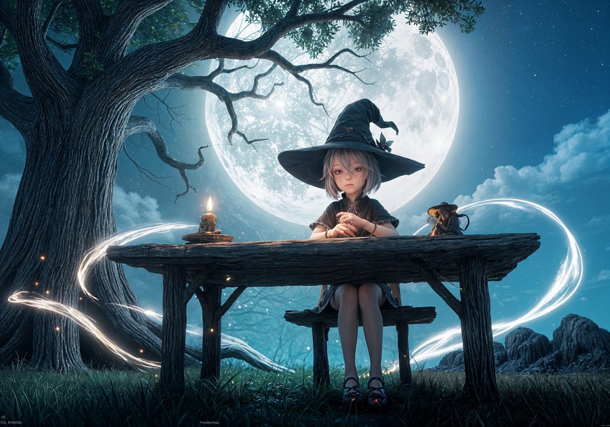 This masterwork image shows a young witch at a gnarled table under a spooky tree on a moonlit night, surrounded by glowing wisps. Rendered in detailed 3D anime art with breathtaking quality.