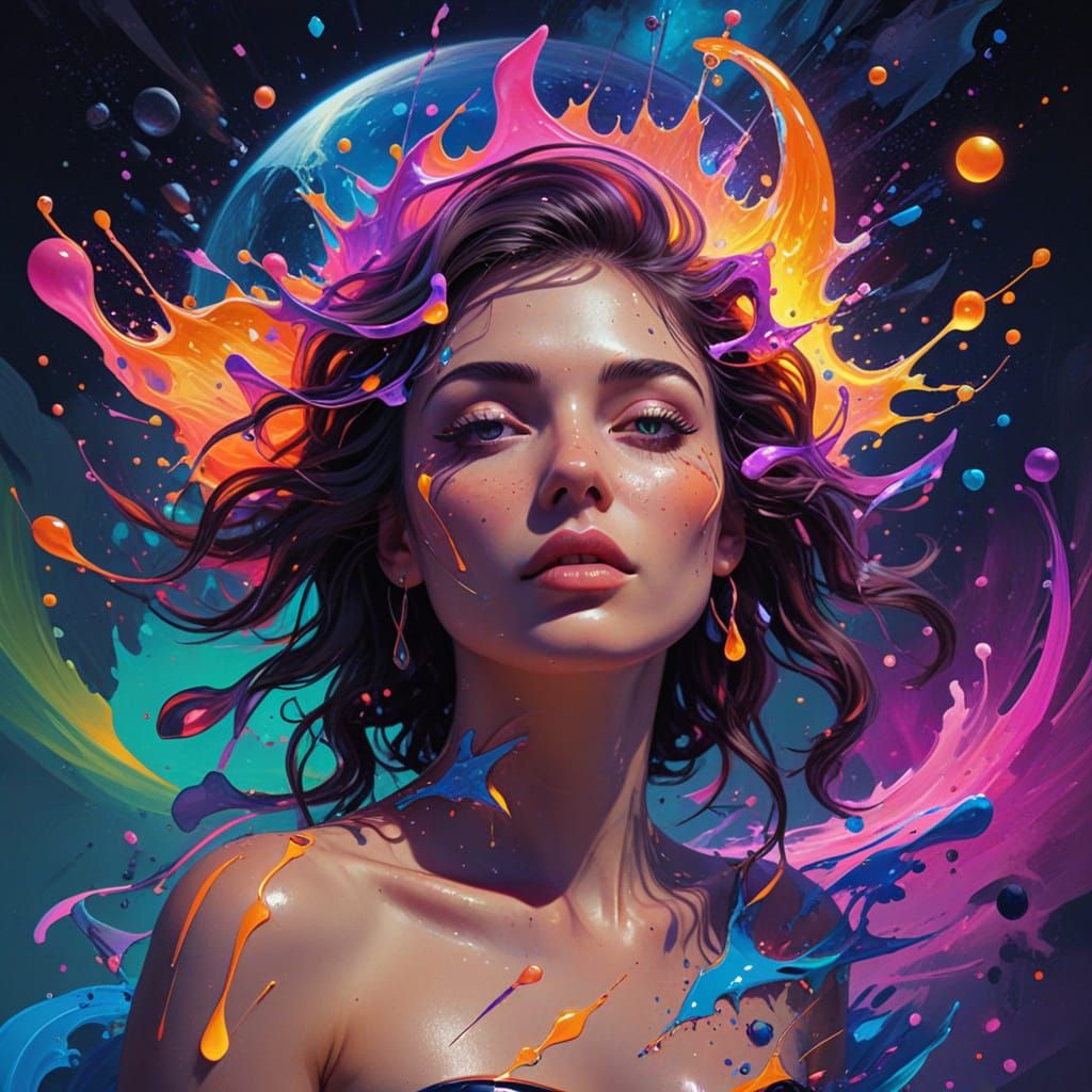 This image shows an abstract digital illustration with oil paint and neon effects. The artwork features melting eclipse fragments, creating a vibrant and surreal composition.